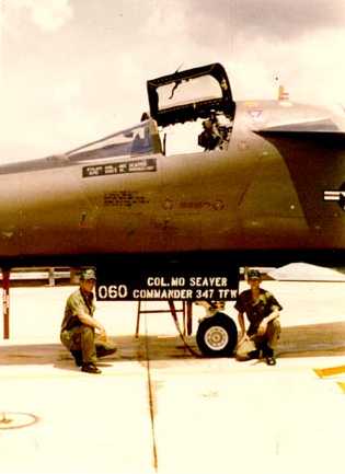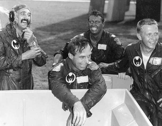 Members of the 44TFS Vampires celebrate their 100th Mission! (Left to right) Bob Piper, Mo Seaver, Bear Chambers and Bill Kriz (thanks to Bill Kriz for corrections!)