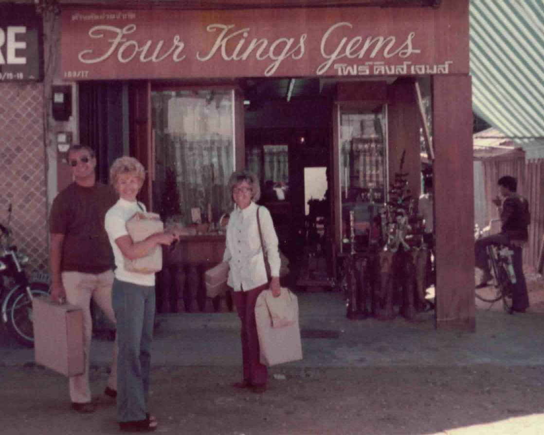 This is a 1972 picture of the Four Kings Gems jewelry store in Korat. Mayo and Carol Wetterberg and my wife, Jean standing in front of it.
