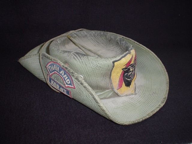 USAF "Aussie" hat history. This is my original hat, bought at the Korat BX in late June, 1966. The way I remember it, these hats were not endorsed by all the top AF brass, but were allowed in Thailand for sure, I do not know about USAF in Vietnam proper. I am foggy on if only pilots and flightline personnel were the only ones allowed to wear the hats. Not everyone bought this style of hat while I was there from June 5, 1966 to June 5 1967. I was one of the very few who even wore a squadron patch other than the pilots and most crew chiefs--on clothing. I was very rare in sewing my 13 TFS patch on the front of my hat. This original hat served me well and has never been washed of the sweat from hot summer Korat days (and warm nights, too) loading those Wild Weasel F-105s 12/6. I carried a small "Bowie-style" knife in the folded-up brim on one side as we we not allowed any other protection on our person in case the base got stormed. Thankfully, it never did. Dirty and dusty, it brings back proud memories of a time in my life that I would not trade for anything on earth. It is in my Will to go with me in the end. I had a Royal Thai Air Force metal lion head with sword-in-mouth I bought on base on one flap. It is not on this hat for the photo as it is with my good friend and neighbor, a 46 year-old Sea Bee who is in Iraq from Sept 2004 to ?? I told him I was 13th AF, 13 TFS and this Thai lion saw me safe on my tour--and I promised it would do the same for him in Iraq. The inside of this version of this hat is Sage Green.