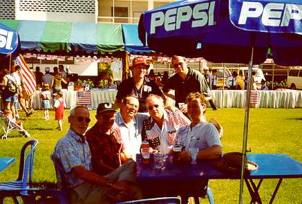 Ron Brown with arm around Al Eberhart. Al was a Takhli Thud driver who stayed on in Thailand and established a printing business. He wrote a "Tiger in the Skies", (fiction). Les is wearing his Air America hat, and Mac is wearing his familiar red "Party Hat".