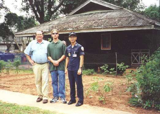 Ron Brown, Geoff Brown, and Major Prapun Jantawee in front of my old hootch, July 2000. They are completely solid walled now, and have windows. Plus, tons of trees!