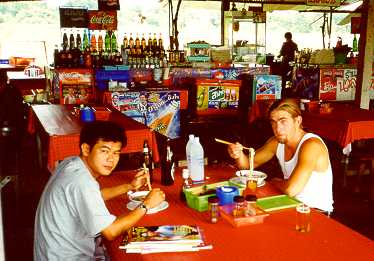 Annop ( I called him NA) and my son Geoff, 21, eating at the cafe at the Banyan Tree in Phimai in July 2000. NA is 35, and father was a Thai mercenary in Laos in the 60's and 70's.