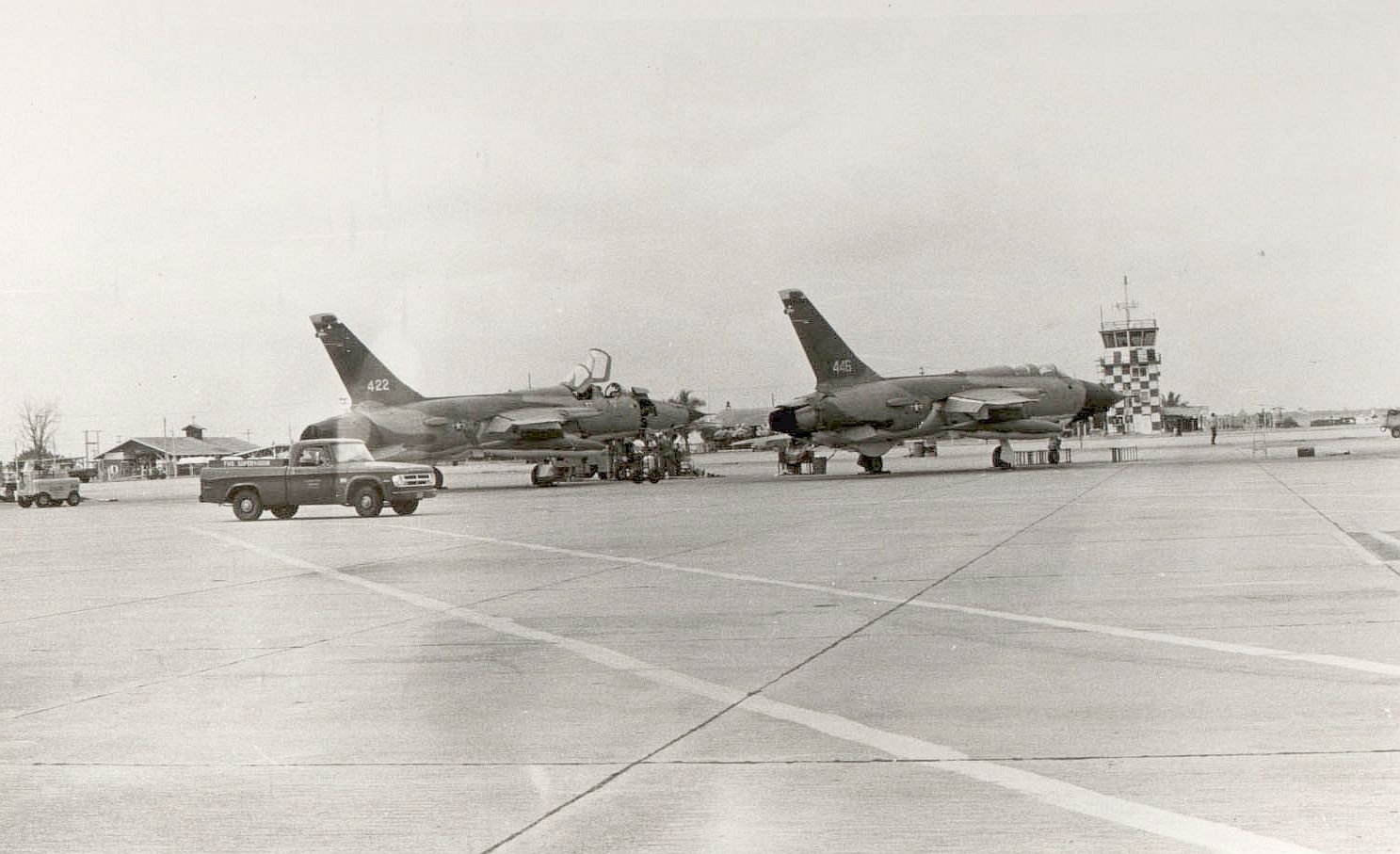 The last two thuds (Weasels) to leave S.E.A. The 17th TFS (if I remember correctly) went home the previous day. One of these two aborted for a hydraulic problem, and his wingman stayed with him. Both left the next day.