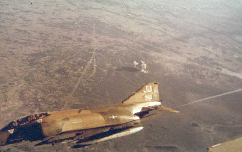 Mk-82 500lb bombs dropped in Cambodia; note the single hung bomb underneath the Phantom II.