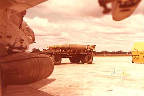 2000lb G.P. Bombs wait aboard the trailer. One will be loaded on the pylon in upper right part of photo.